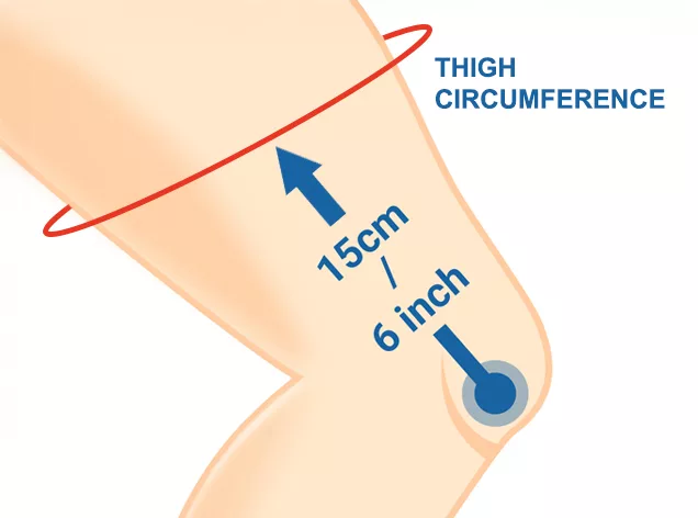 - 2. Omotejte měřicí pásku kolem nejširší části stehna přibližně 15 cm/6" nad středem vašeho kolena.