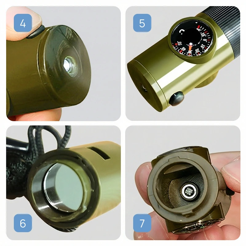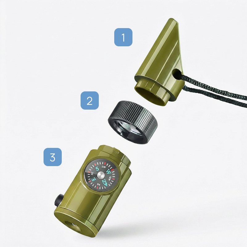 Hlasitý signál, jasná svítilna a praktické zrcátko rychle přitáhnou pozornost. Uložte malé nezbytnosti bezpečně, připravené kdykoli k použití.