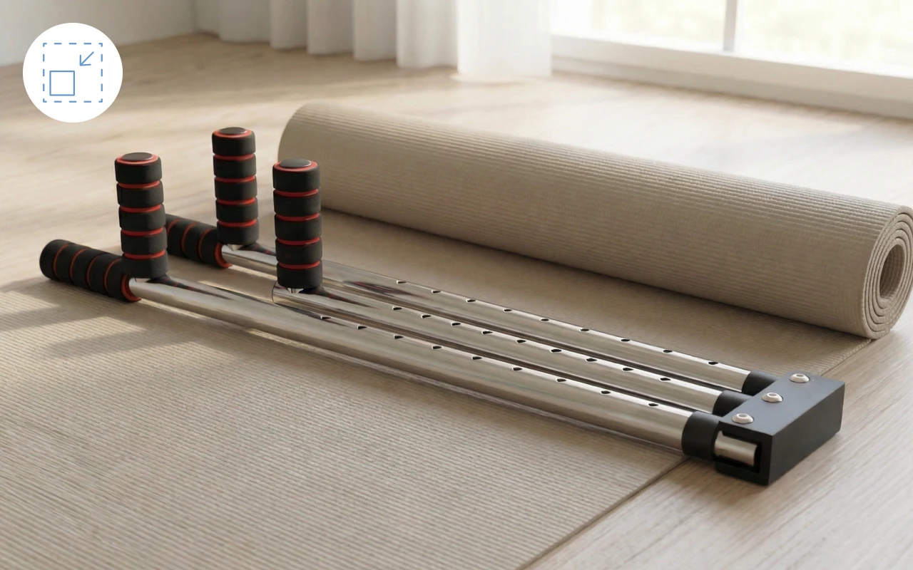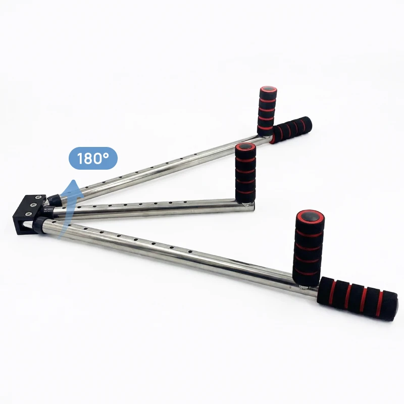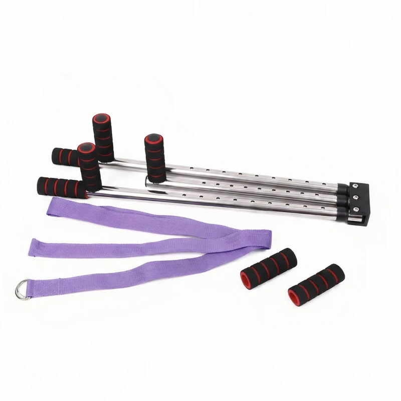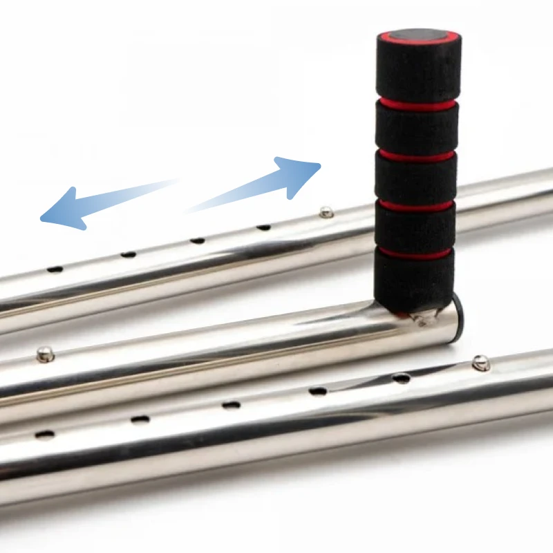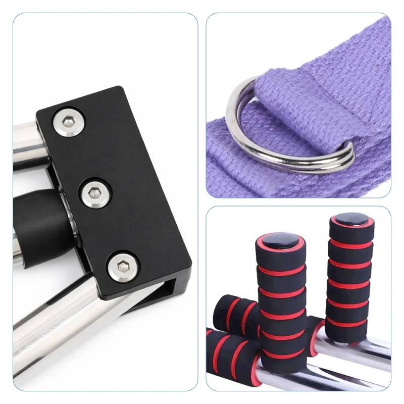 Nerezové tyče a polstrované úchyty nabízí dlouhodobou oporu. Měkká pěna šetrně polštářuje chodidla pro bezbolestné protažení.