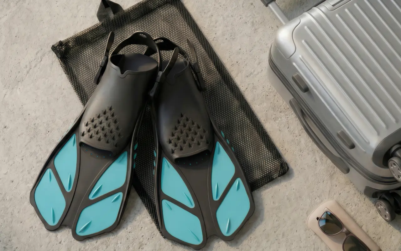 Tyto ploutve sedí jak mně, tak i manželce díky jednoduchému systému pásků. Na cestách si je mezi sebou střídáme a síťovaný vak udržuje písek mimo naše zavazadlo.