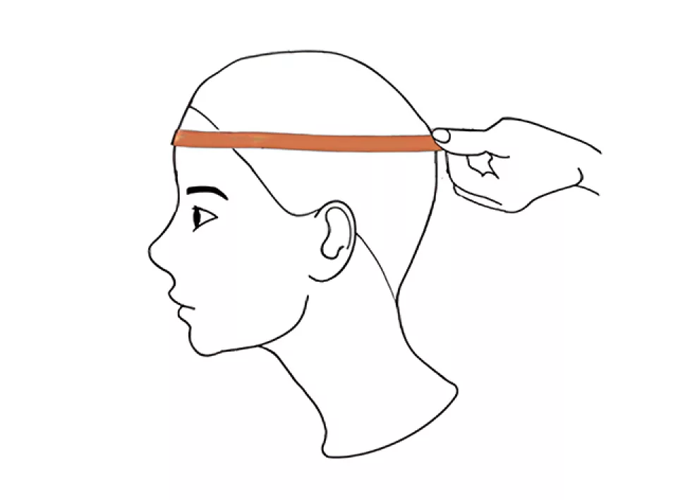 - 1. Omotejte měřicí pásku kolem nejširší části hlavy, těsně nad obočím a ušima.