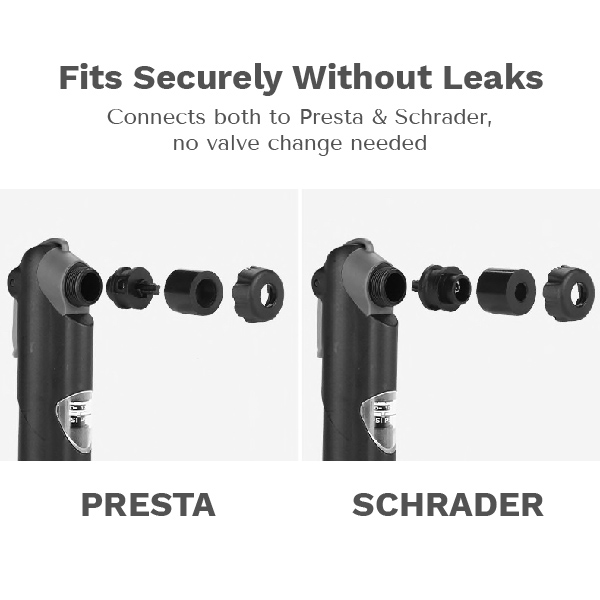 ✔️SNADNÉ POUŽITÍ — Není potřeba žádná hadice pro připojení k pneumatice. Funguje s ventily Presta i Schrader — rychlým přepnutím ventilu (bez nutnosti nástrojů) přizpůsobíte pumpu oběma typům pneumatik.