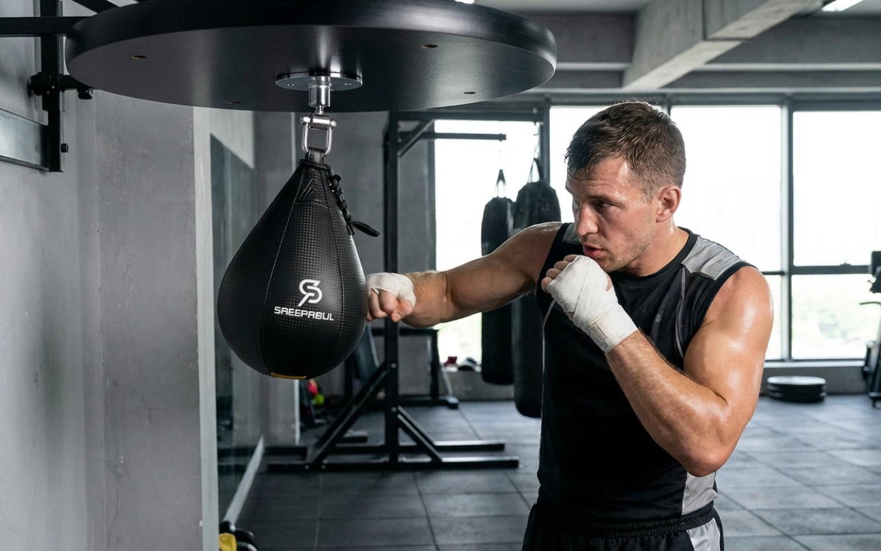 Tenhle rychlostní pytel mám zavěšený nad lavicí doma. Pravidelný odraz mi pomáhá držet dobrý rytmus a moje nohy se přirozeně přizpůsobují tempu.