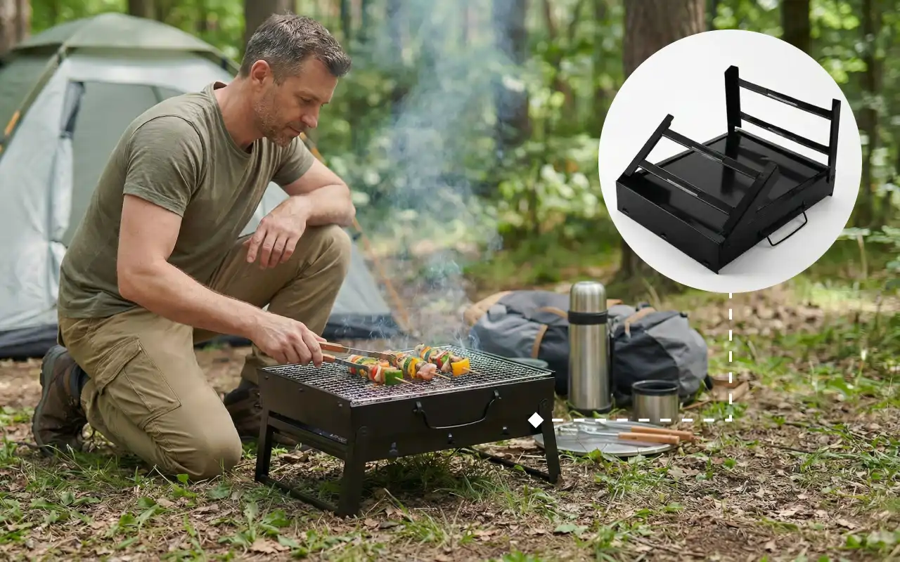 Koupila jsem tento skládaný gril na výlety na pláž s přáteli. Rychle se rozehřeje, zvládne spoustu špízů a nerezový povrch stačí otřít jen vlhkým hadříkem.