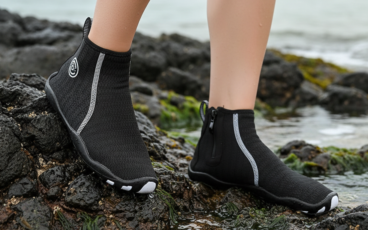 Vysoký střih chrání kotníky před ostrými kameny i horkým pískem. Odolné podrážky snižují klouzání a poskytují stabilitu na mokrém nebo nerovném povrchu.