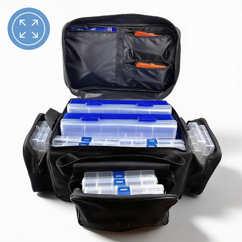 Tato taška mi pomáhá rychle zabalit. Zipy fungují hladce a organizace vlasců i háčků je teď hračka.