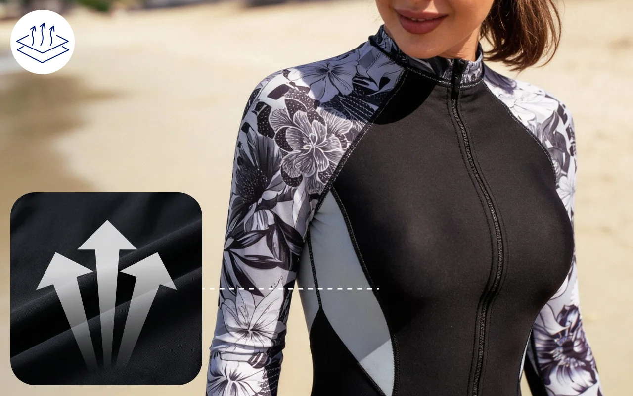 Materiál rychle schne po každém plavání nebo potápění. Můžete se rychle vrátit k odpočinku nebo zábavě bez pocitu chladu nebo tíhy.
