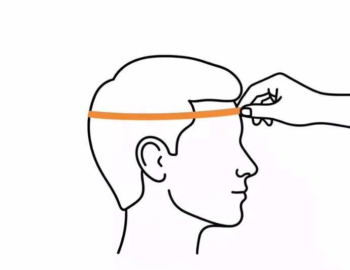 - 1. Omotejte měřicí pásku kolem nejširší části hlavy, těsně nad obočím a ušima.