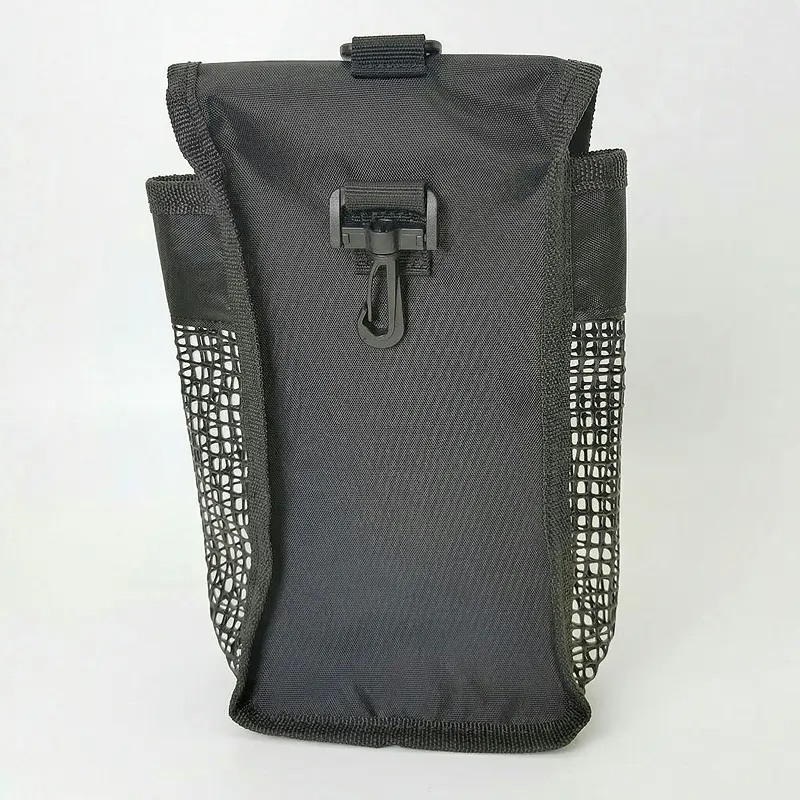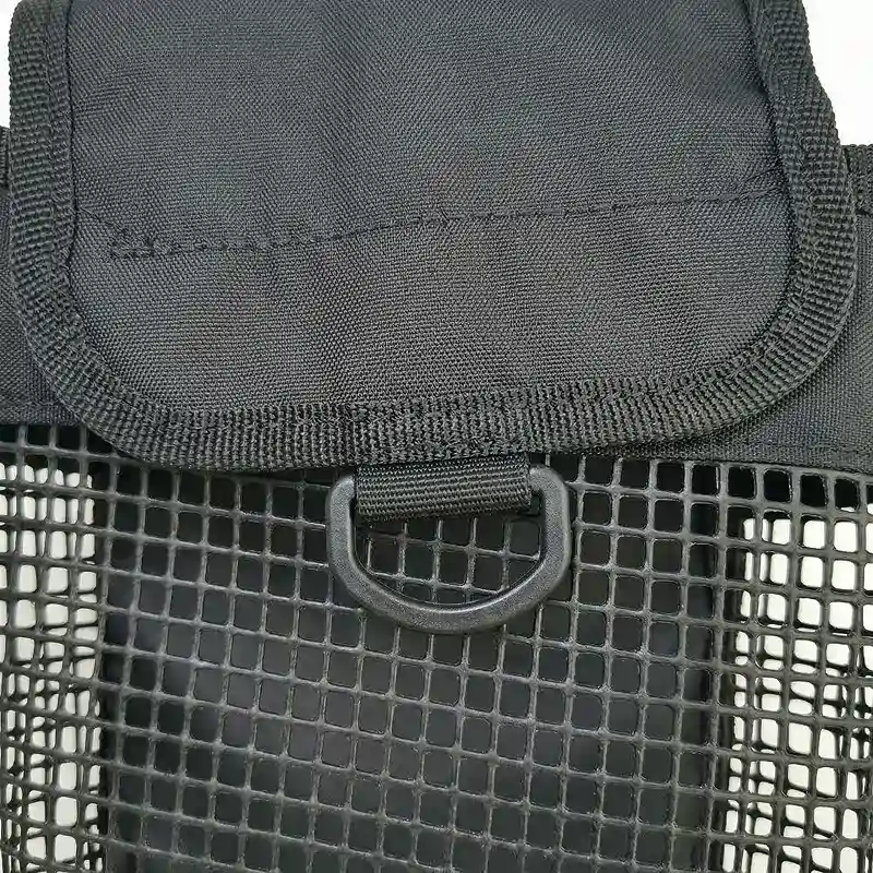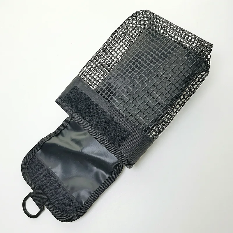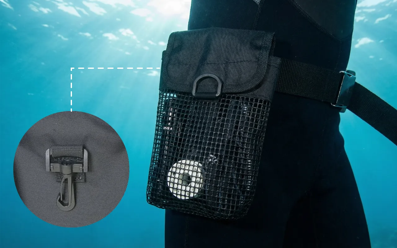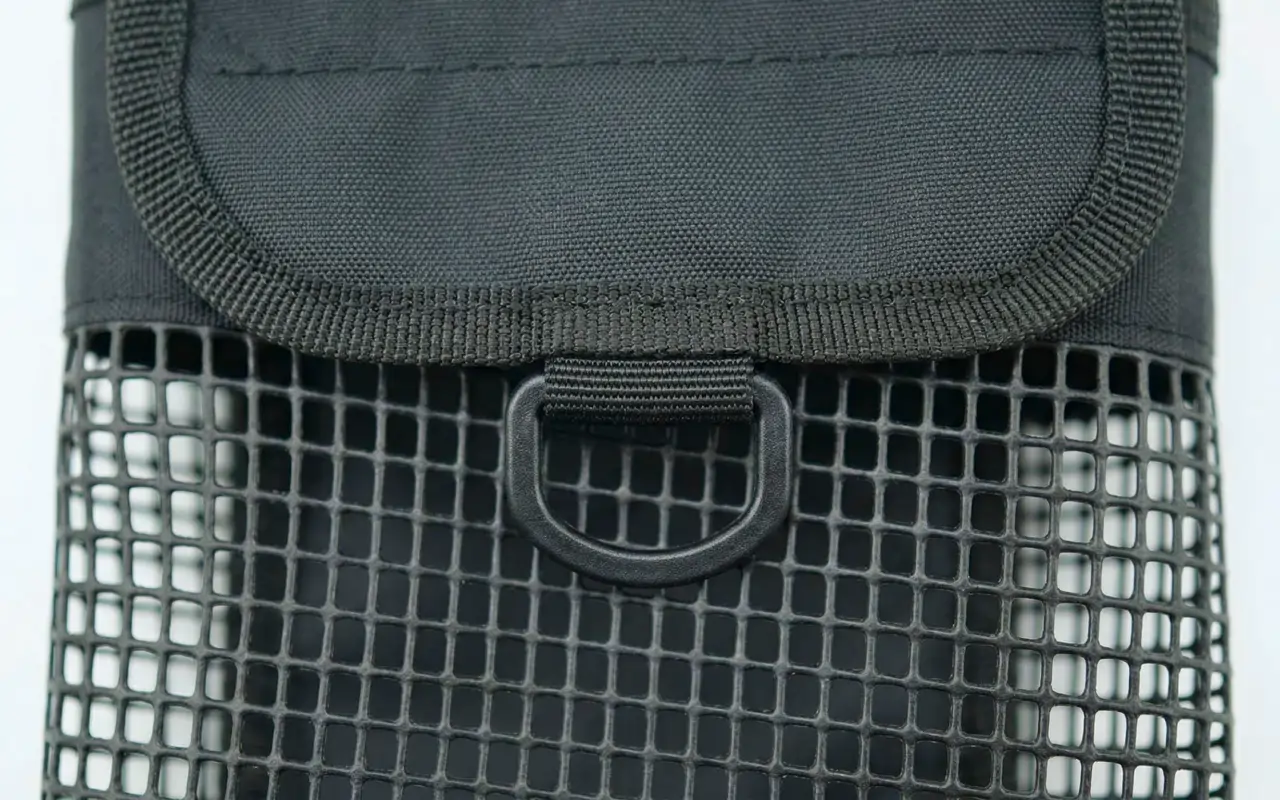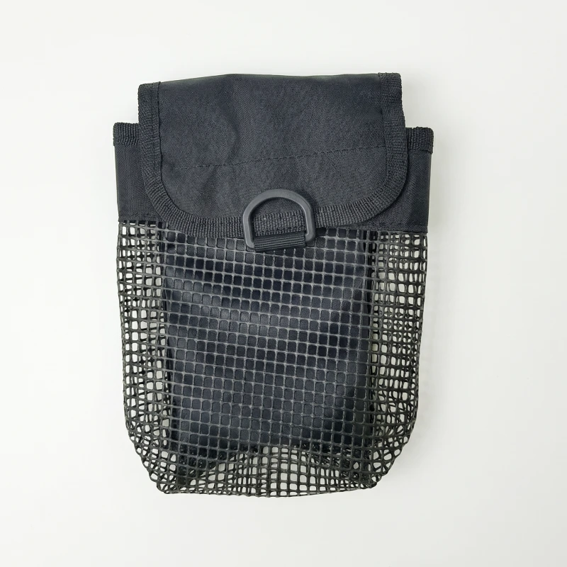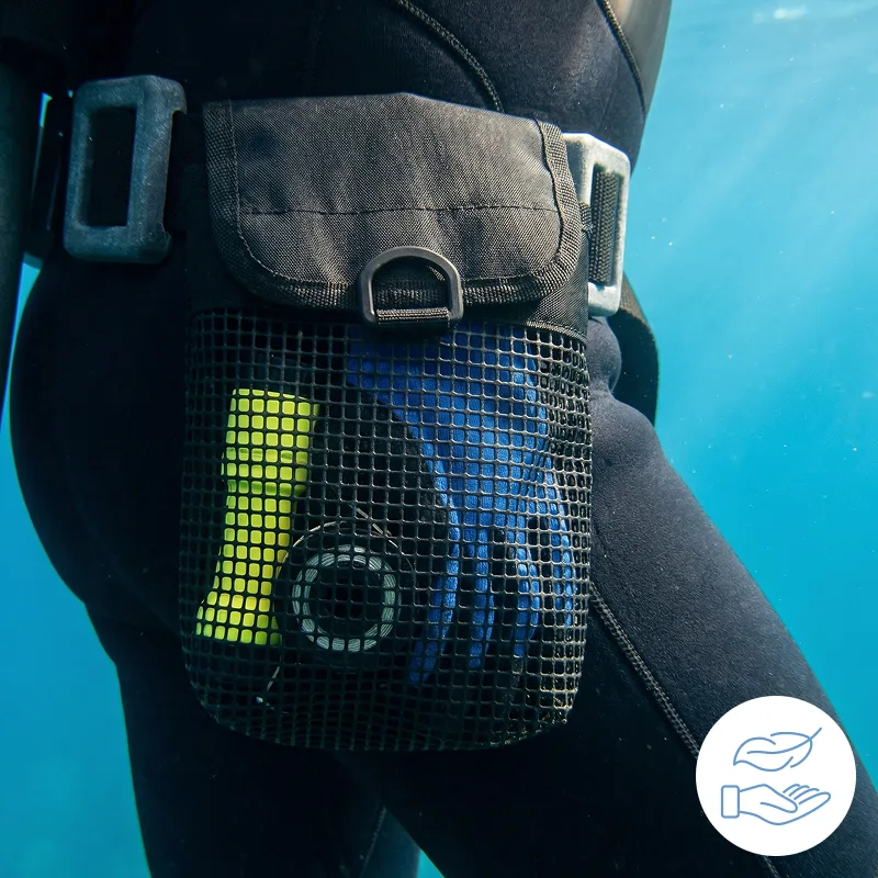Používám ho na opasku během podvodních úklidů. Mám v něm stahovací pásky, malé nástroje a značky. Síťované strany nechají písek a vodu hned odtéct, takže vše zůstává čisté.