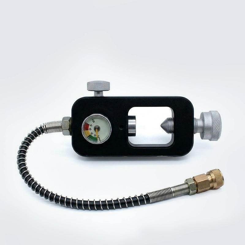 Praktický doplňovací adaptér, přehledný manometr, rychlé doplnění láhví.