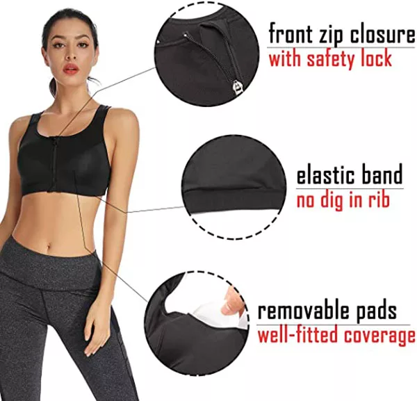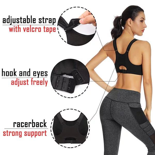 I-tvarované ramínko na zádech účinně chrání před nárazy a zabraňuje posunu nebo sklouznutí podprsenky. Podprsenka má zip proti sklouznutí a háčky, které zabraňují sklouznutí při cvičení. Nastavitelný podpůrný pás na zádech, podobně jako u běžné podprsenky se 3 řadami háčků, umožňuje přizpůsobit velikost košíčků.
