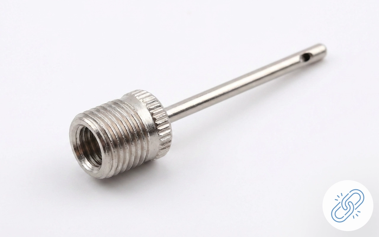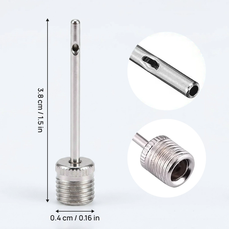 Tento kovový nafukovací nástavec používám s cyklistickou pumpou na basketbalové večery. Připojí se pevně, žádné syčení vzduchu, a splasklé míče rychle oživí.