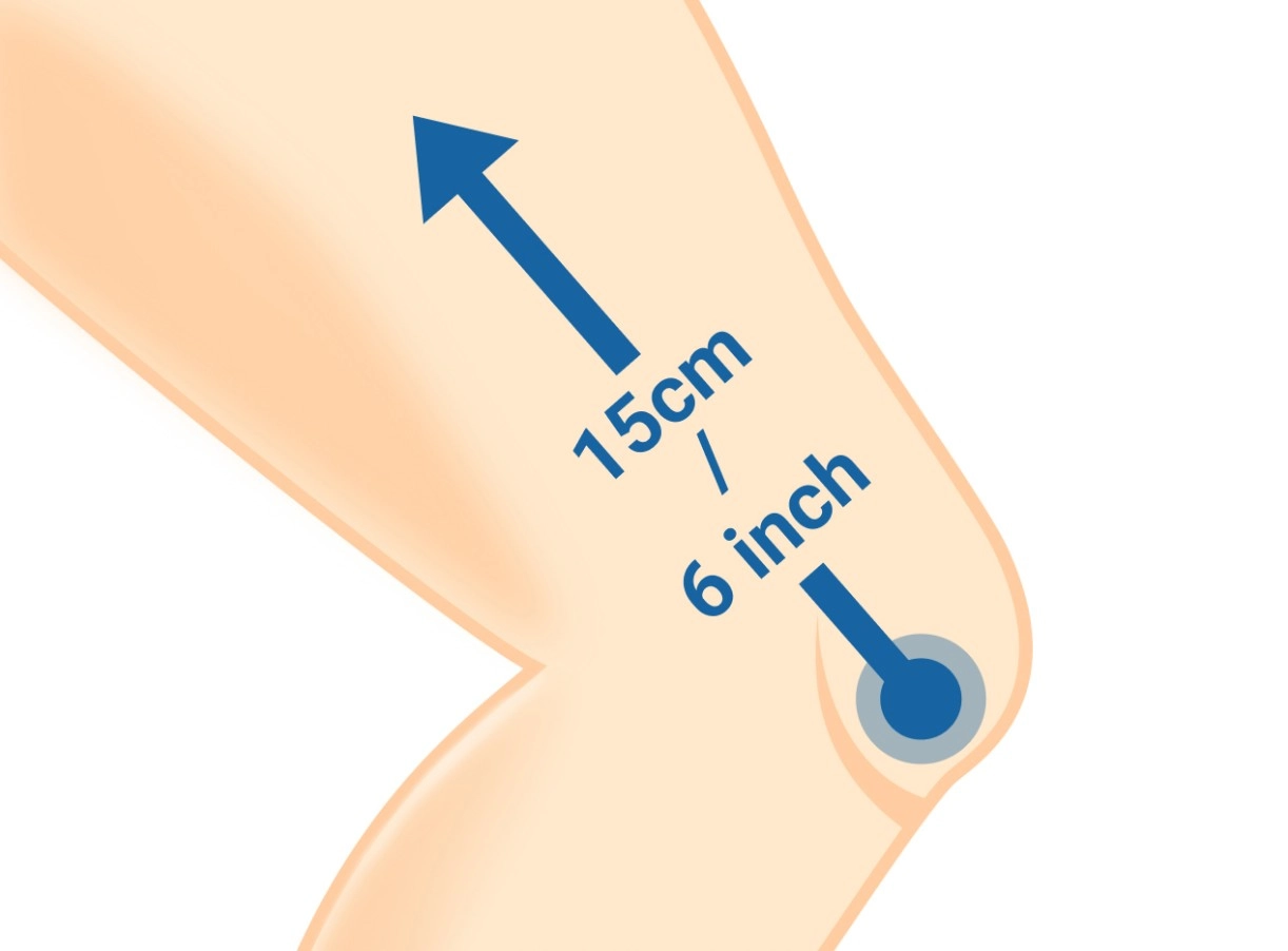 - 2. Omotejte krejčovský metr kolem nejširší části stehna přibližně 15 cm/6" nad středem čéšky.