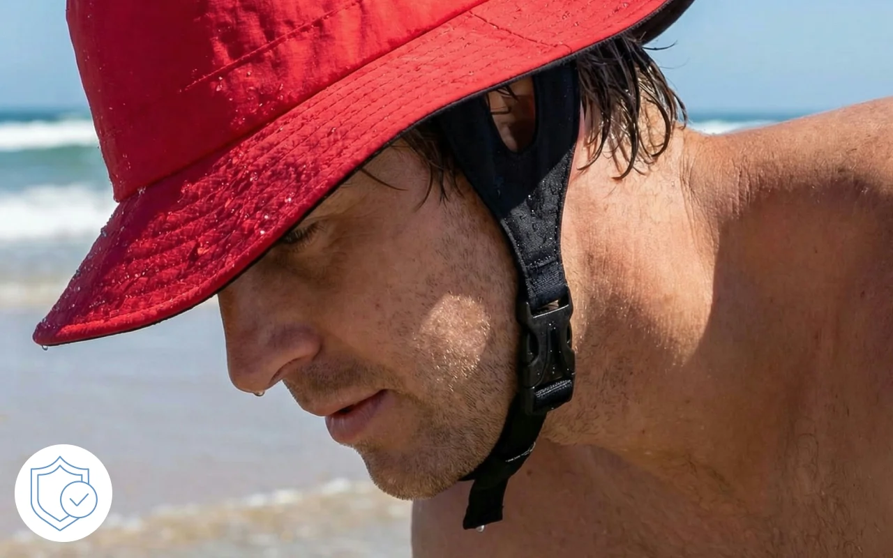 Řemínek pod bradou se rychle přizpůsobí jakémukoli tvaru či velikosti hlavy. Klobouk zůstane na místě i při silném větru nebo aktivním pohybu.